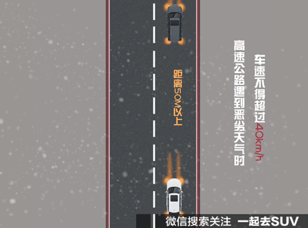 中國法令規定,機動(dòng)車(chē)在高速公路上行進(jìn),遇有霧、雨、雪、沙塵、冰雹等低能見(jiàn)度小于100米時(shí),敞開(kāi)霧燈、近光燈、示廓燈、前后位燈和風(fēng)險報警閃光燈,車(chē)速不得超越40km/h,與同車(chē)道前車(chē)堅持50米以上的間隔。